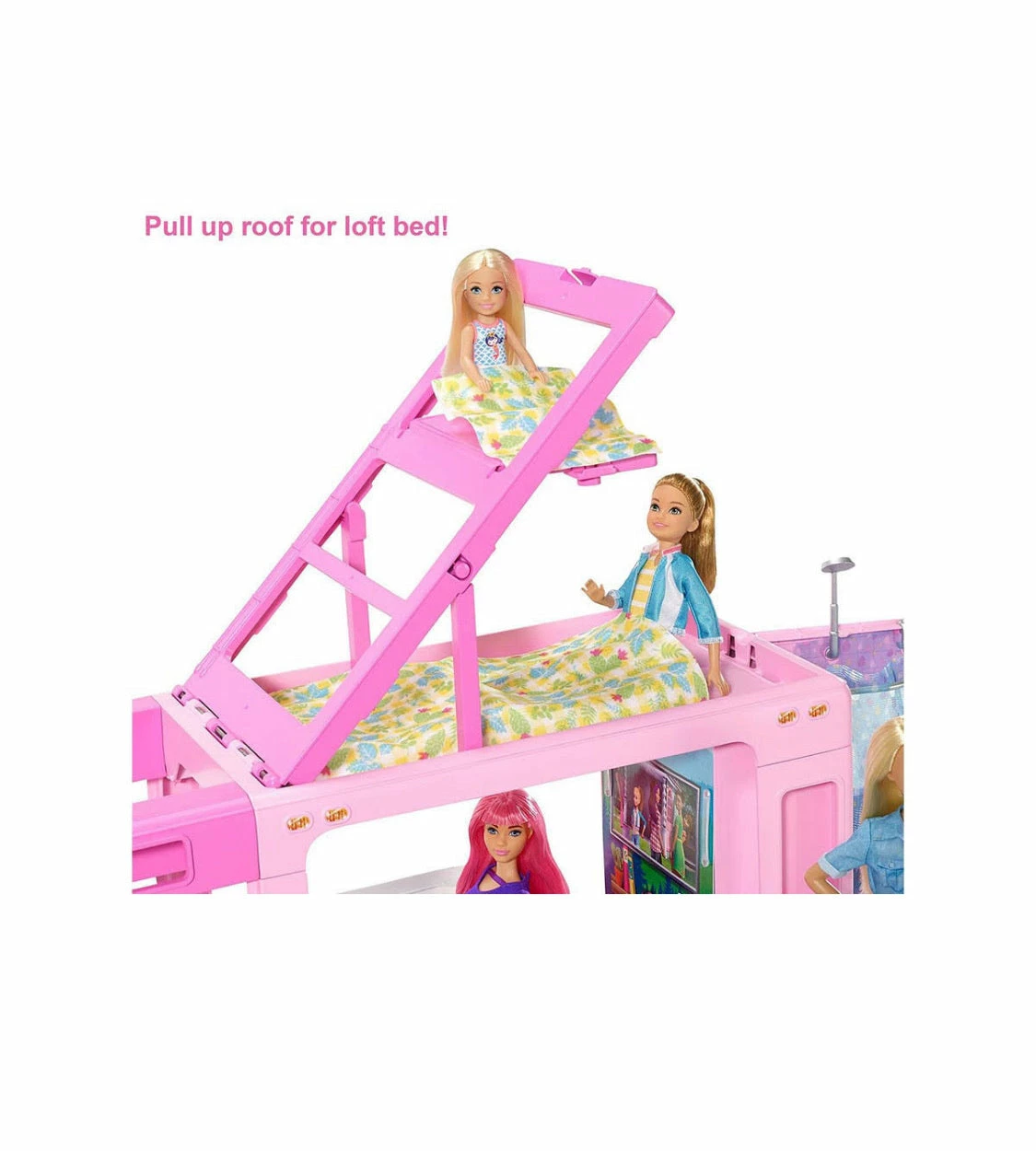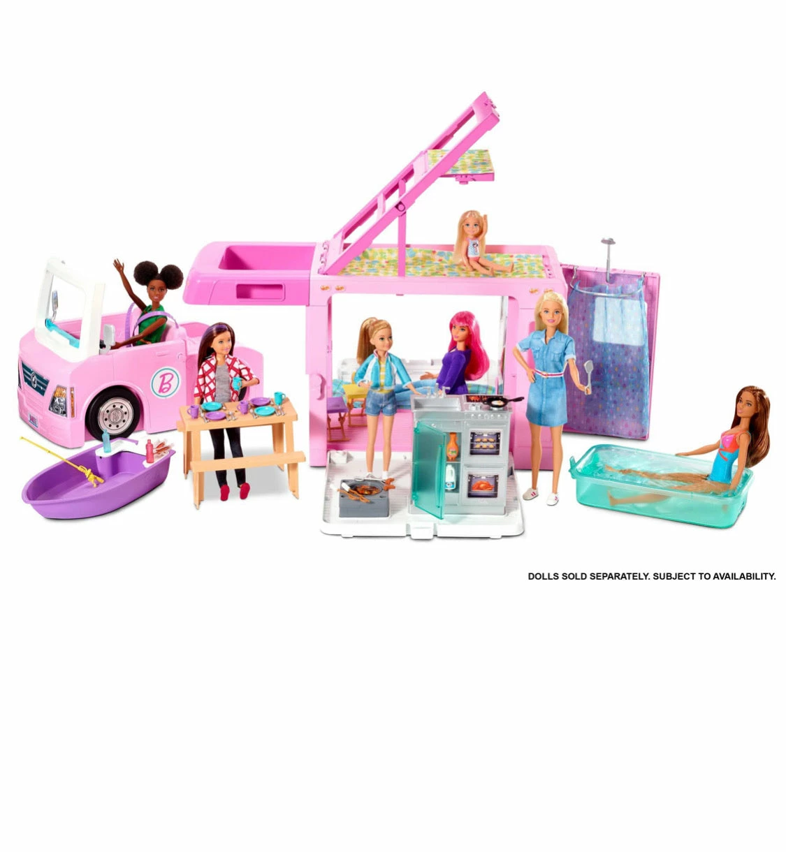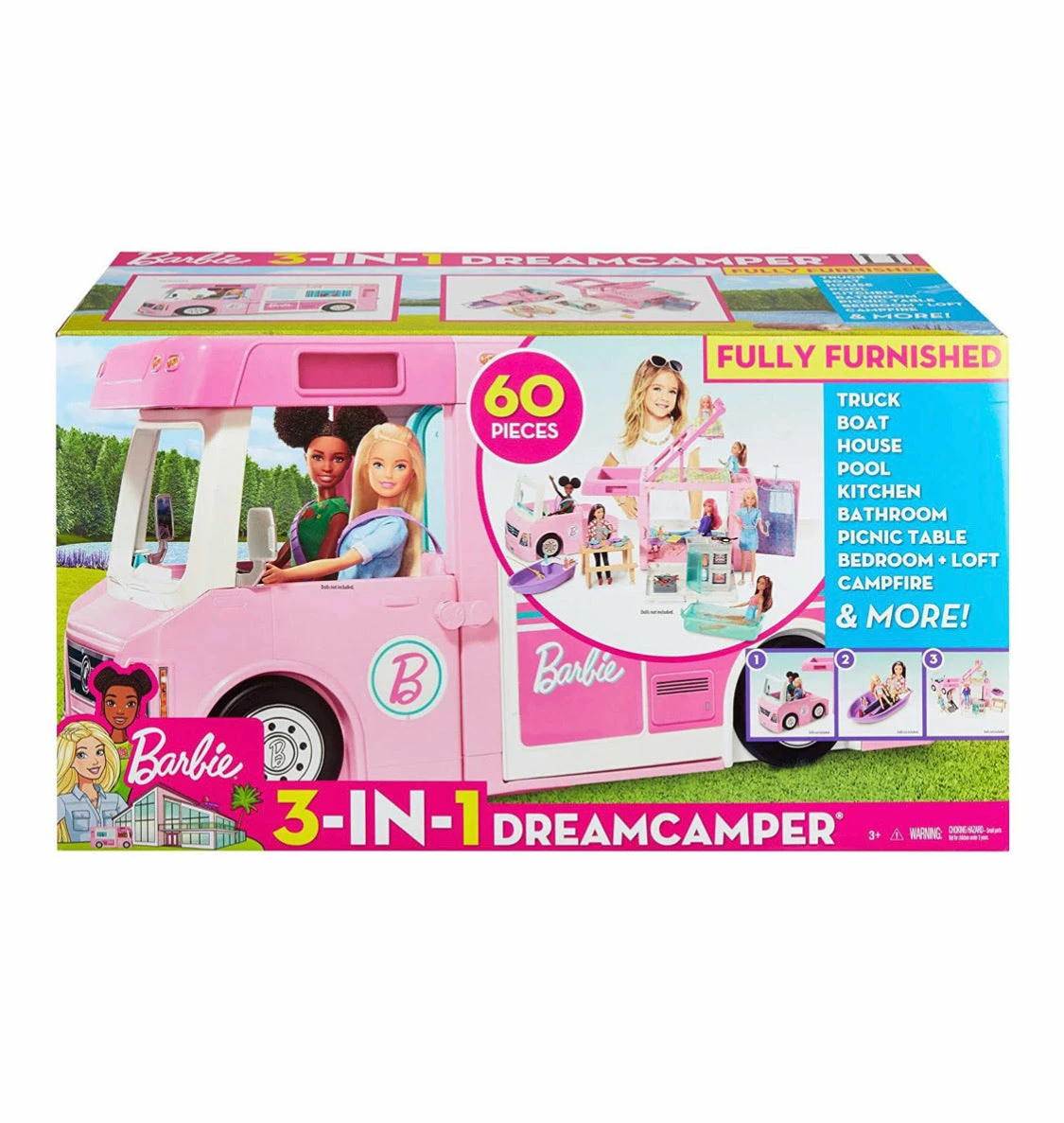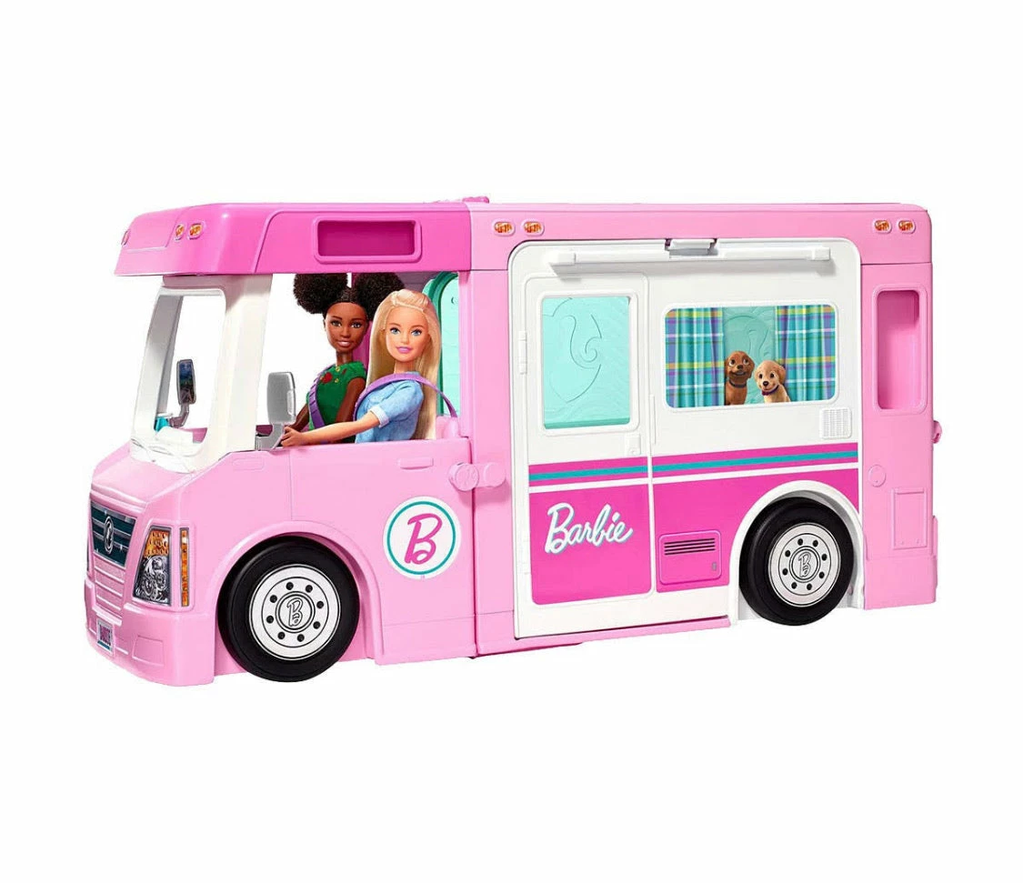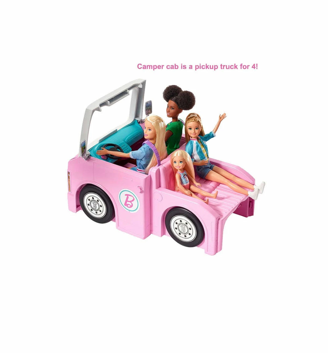 When kids hit the open road in the Barbie 3-in-1 DreamCamper, their stories can go wherever their imaginations lead! Multiple transformations and hidden surprises make playtime exciting — give the bright pink camper a push to get the fun rolling. When it’s time to explore, unlatch the front of the camper to reveal a pickup truck that seats four.