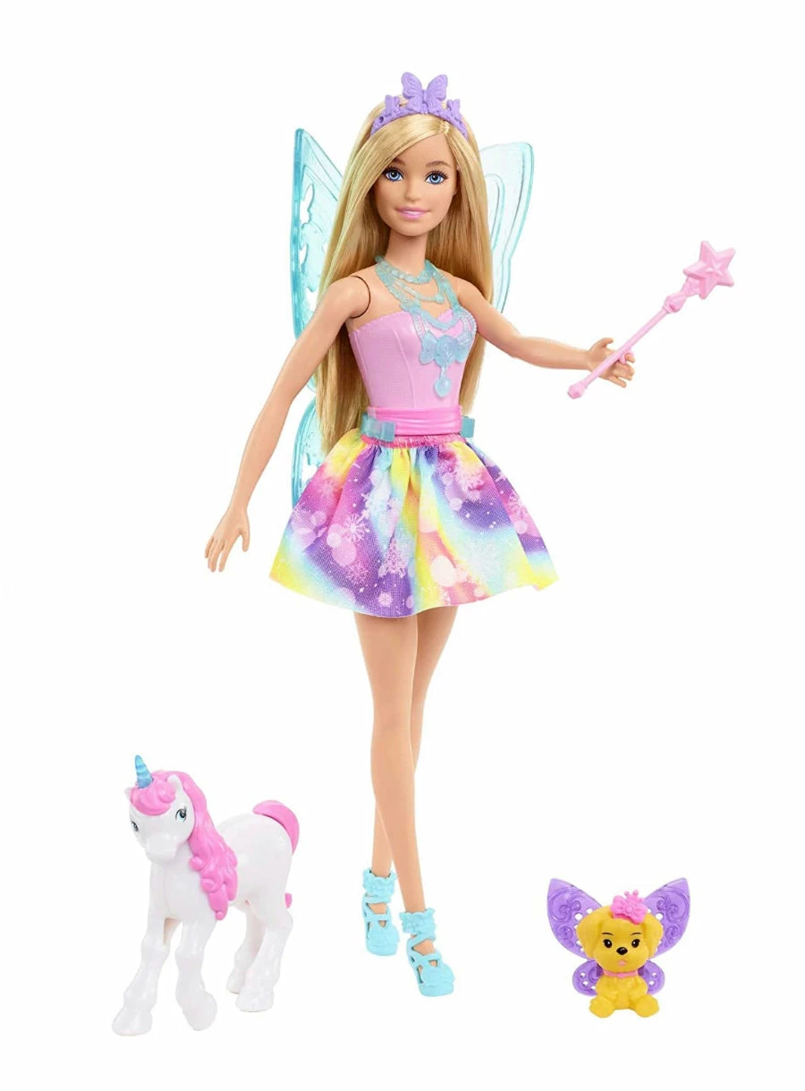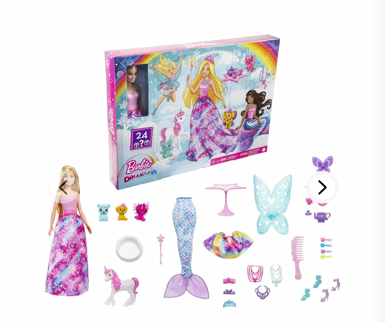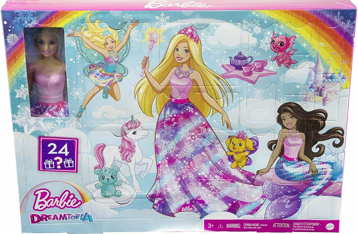 Contents: 1 x Barbie Dreamtopia Advent Calendar including 1 x doll with 24 surprises: 2 skirts, 1 x pair of wings, 1 x mermaid tail, 2 x pair of shoes, 3 x tiaras, 3 x necklaces, 1 x wand, 1 x hairbrush, 4 x hairclips, 1 x table, 5 x tea set pieces Also includes: 4 x animal figures, 1 x pet bed With 25 days of surprise gifts Discover Barbie doll on day one, then – for the next 24 days – open a new present That could be doll clothing, an accessory or storytelling piece Surprise accessories include colourful shoes, tiaras, necklaces, a wand and a hairbrush Mix and match to create new looks Additional surprises feature toys that spark instant storytelling 4 pets including a puppy, bunny, baby dragon and unicorn With 24 days of surprises and endless storytelling possibilities  Celebrate any occasion with this Barbie Dreamtopia Advent calendar featuring 25 days of surprise gifts Kids open Barbie doll on day one, and then reveal a new surprise daily for the next 24 days. Surprises include accessories, storytelling pieces and fashions that let kids dress Barbie doll up as a princess, mermaid or fairy. Each new surprise brings a new opportunity to mix and match and tell a new fairytale Accessories and storytelling pieces, like tiaras, necklaces, pets and tea party pieces instantly expand the playtime possibilities. Doll cannot stand alone. Colours and decorations may vary.